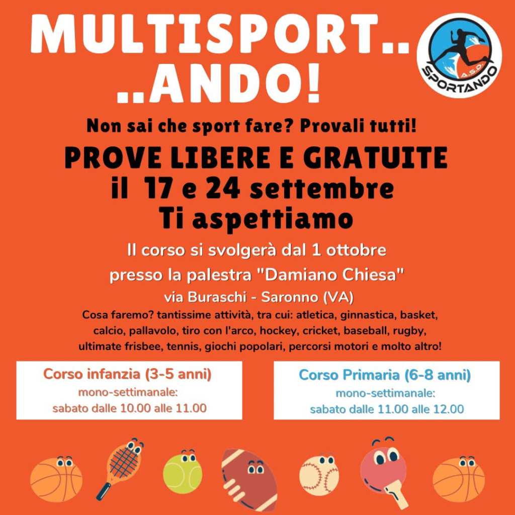 Come ogni anno ripartiamo con il nostro corso multisport rivolto ai bambini dai 3 agli 8 anni. La data di ripresa è fissata per il 17 Settembre presso la palestra Damiano Chiesa di Saronno. Sia per sabato 17 che per sabato 24 le lezioni saranno in prova gratuita!