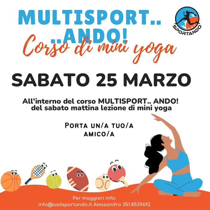 Corso di MINI YOGA Sabato 25 marzo durante i nostri corsi MULTISPORT..ANDO! del sabato mattina faremo una lezione di mini yoga Ti aspettiamo per: • corso ɪɴғᴀɴᴢɪᴀ (3-5 anni) dalle 10 alle 11 • corso ᴘʀɪᴍᴀʀɪᴀ (6-10 anni) dalle 11 alle 12 Porta un/una tuo/tua amico/a! Per maggiori info: info@asdsportando.it - Alessandro 351.8539692 #sport#multisport#asd#asdsportando#yoga#miniyog